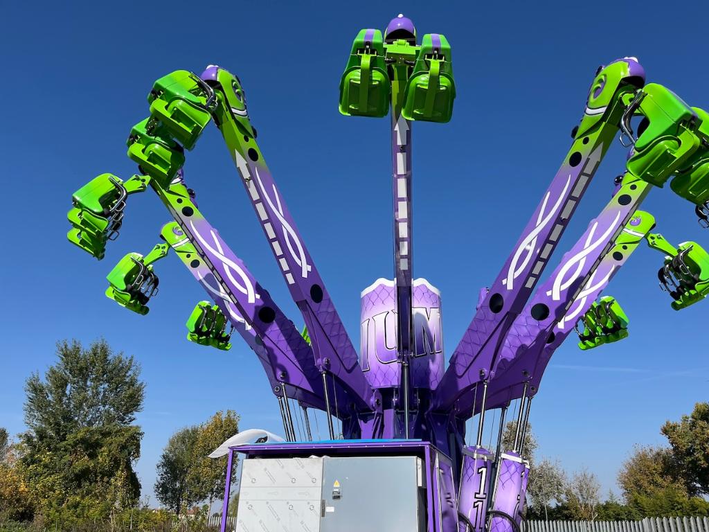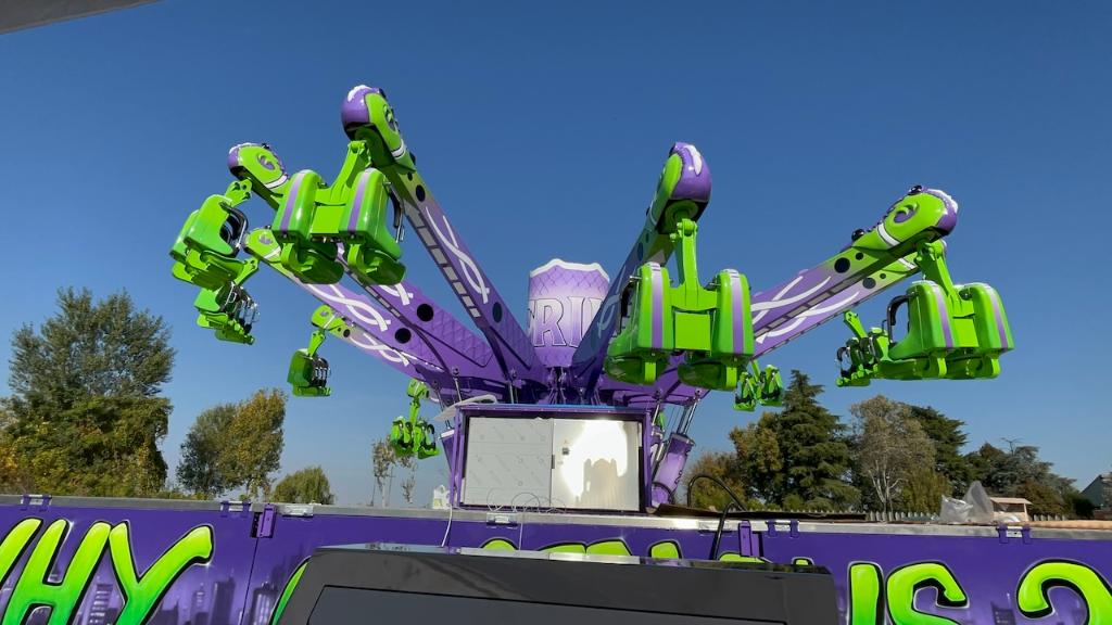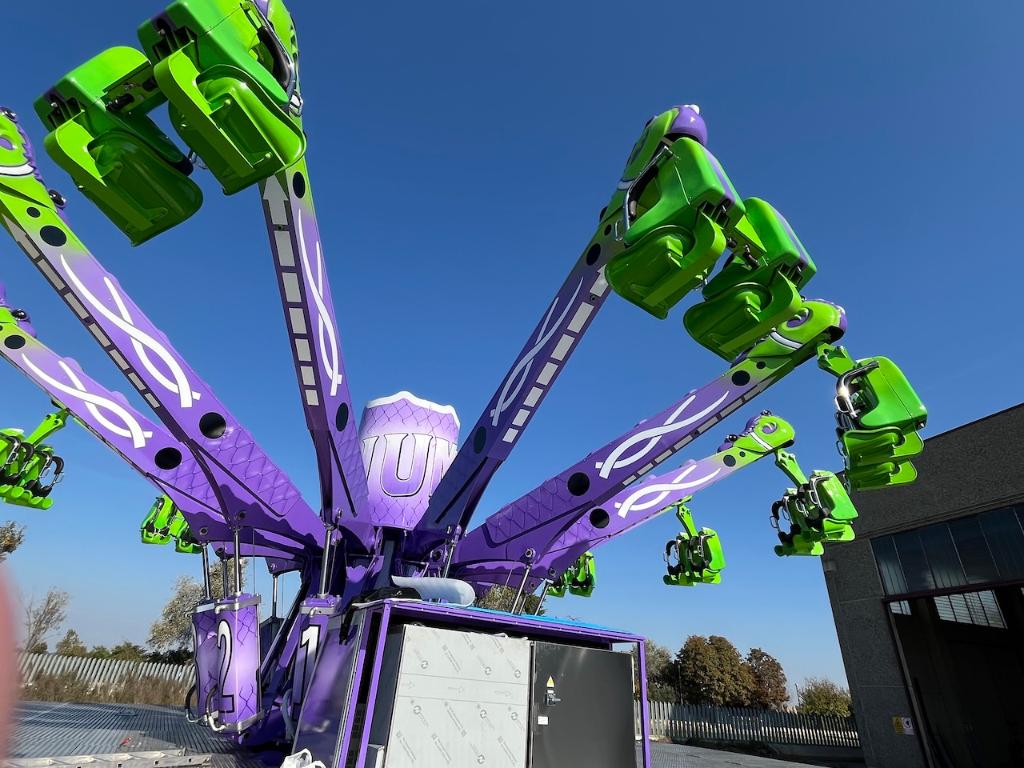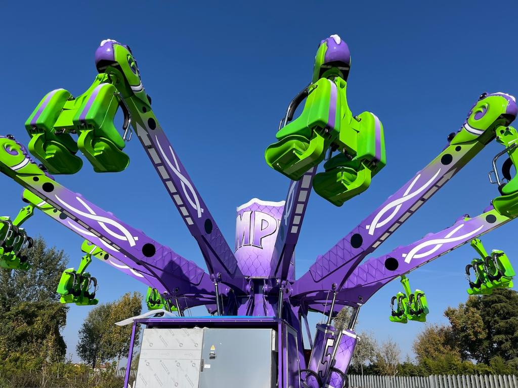 JUMP-SPIN ride in semi-trailer and fixed park versions with 12 arms and 24 seats. It operates with two latest-generation digital compressors that ensure low power consumption, and a control system for the arms' play that guarantees high thrills. The arms' folding system reduces assembly and disassembly time; no cars need to be dismantled.