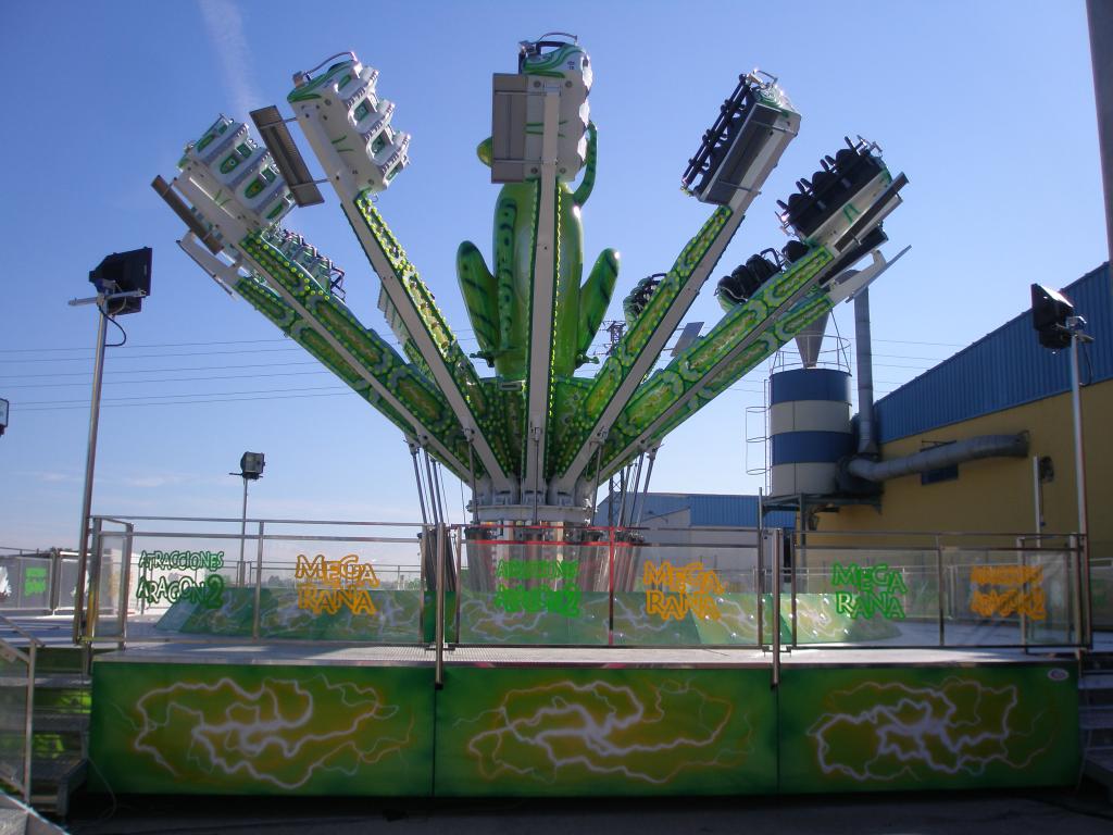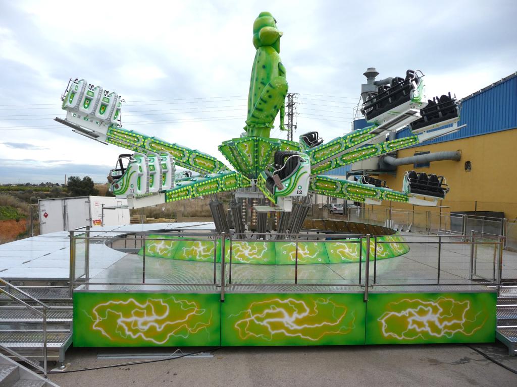 MAXI-SALTAMONTES (FROG) ride in semi-trailer and fixed park versions with n° 12 arms and n° 36 seats. It operates with two latest-generation digital air compressors that ensure low power consumption and a special electronic arms control system that guarantees high thrills. All arms are folding with a system that reduces assembly and disassembly time, no cars need to be dismantled.