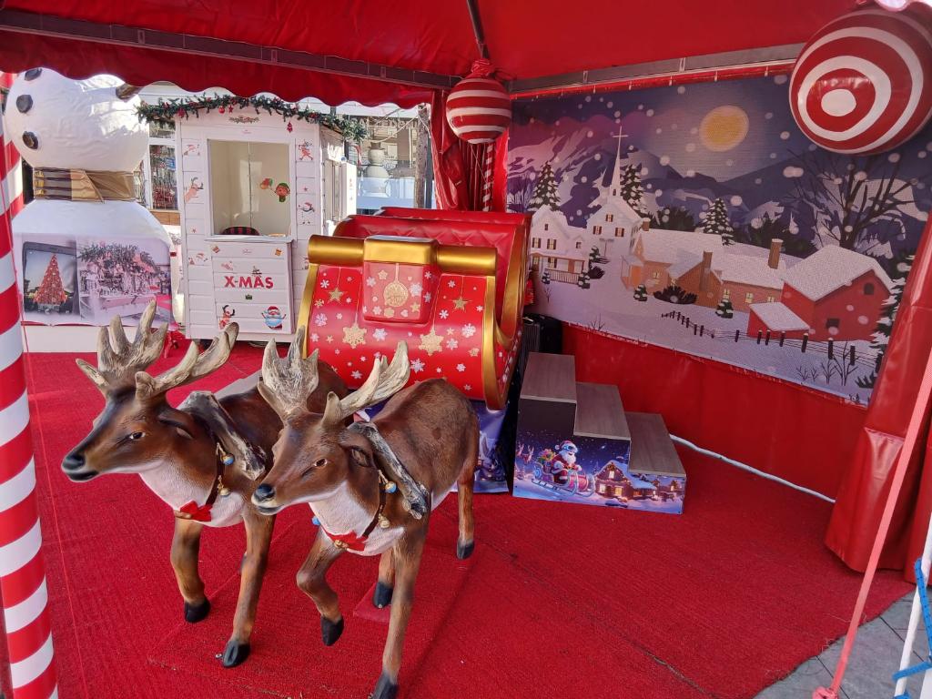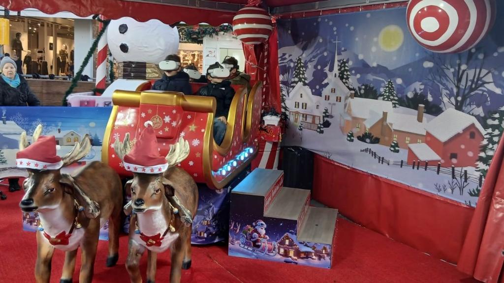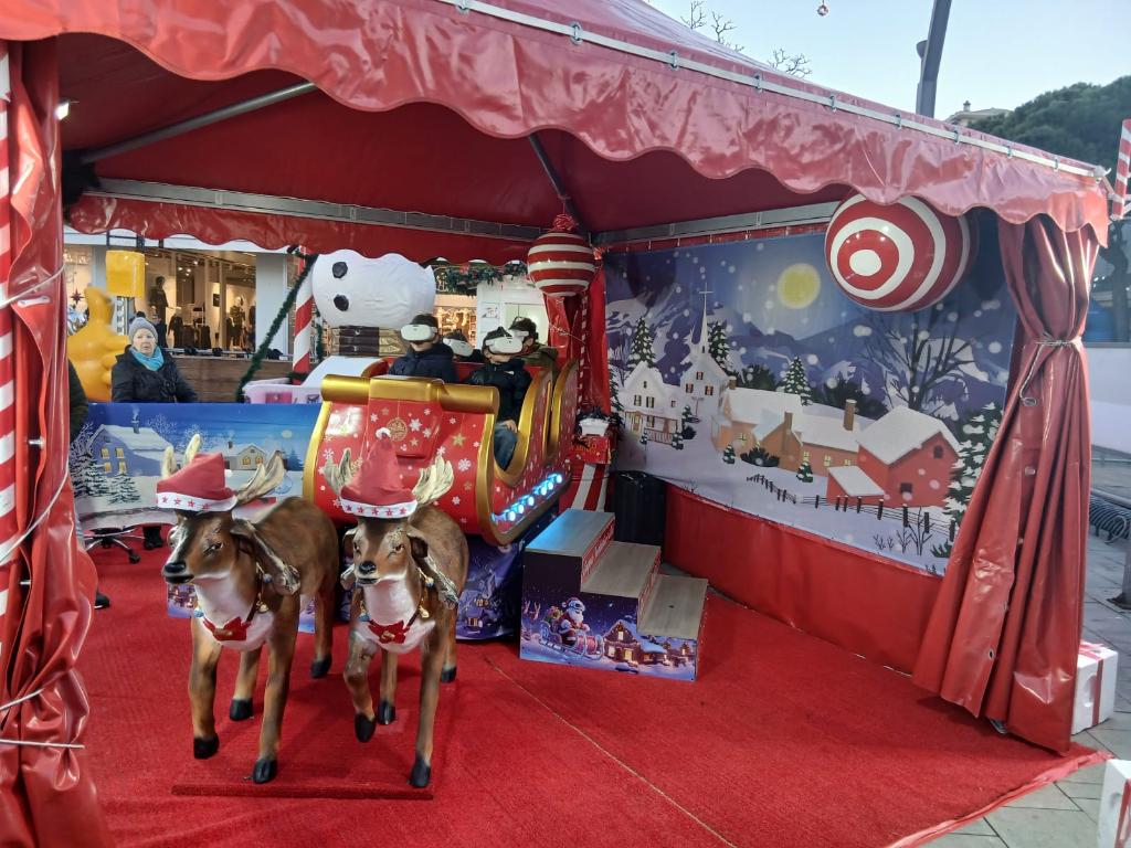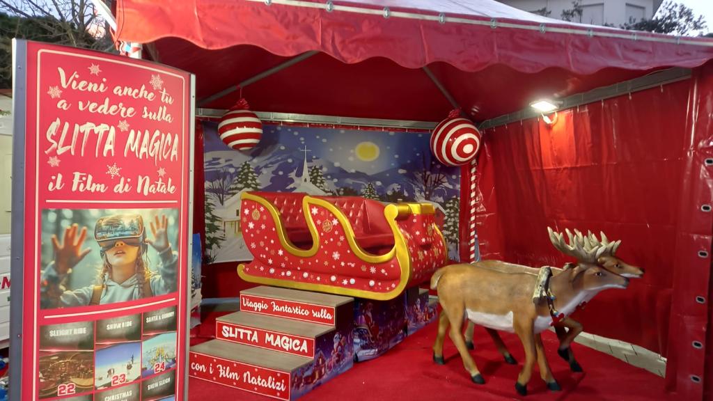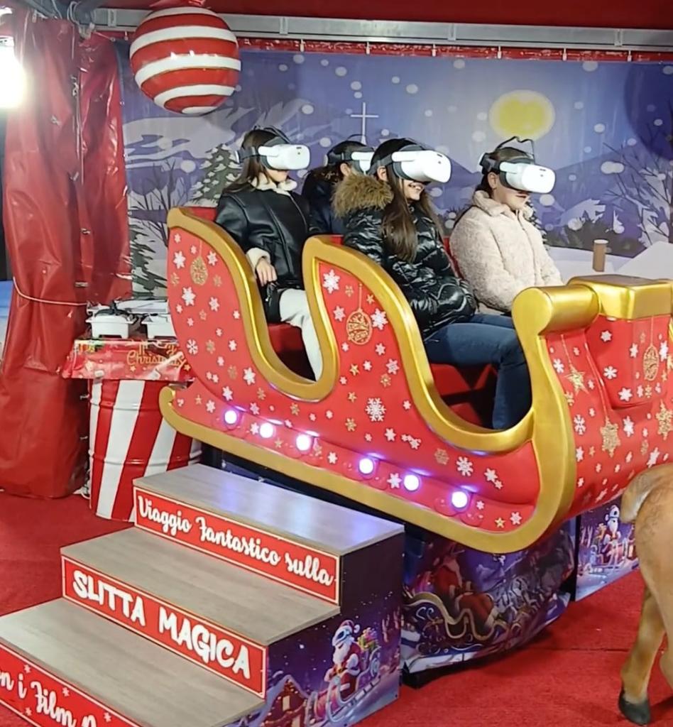 VR simulator with pneumatic system 2025, and° 6 seats, n° 72 films (n° 6 are with Christmas There and the other are generic like roller coaster). Base size 1,8x1x1,6H meters. Power consumption 2kw with 220VAC. Not included operator box and gazebo.