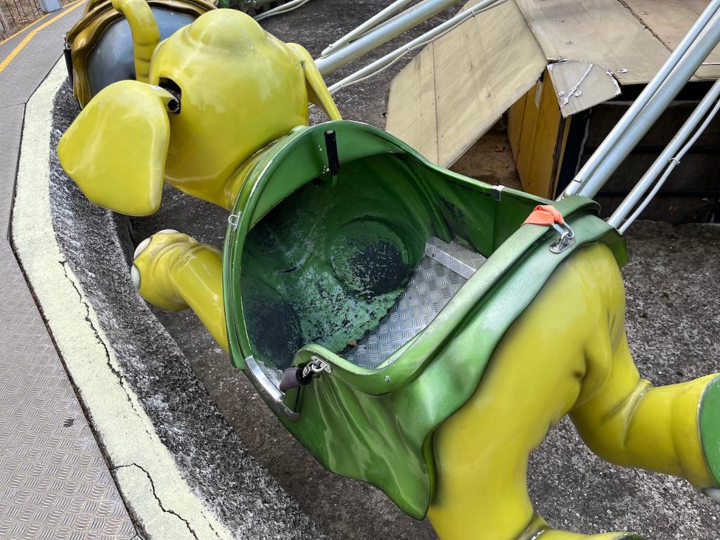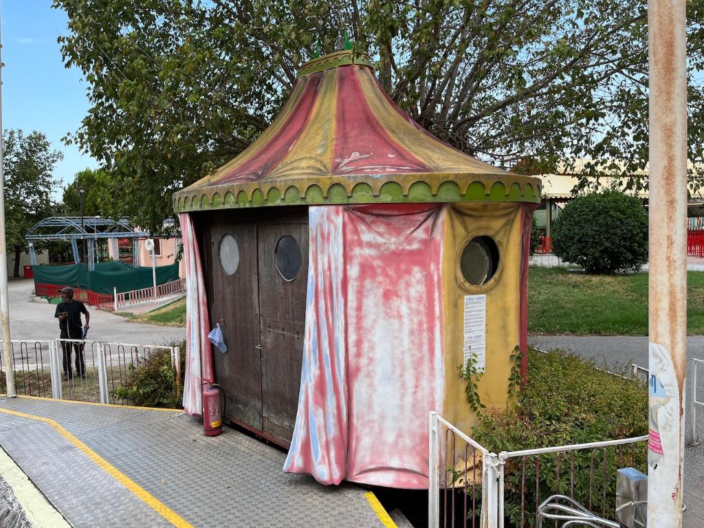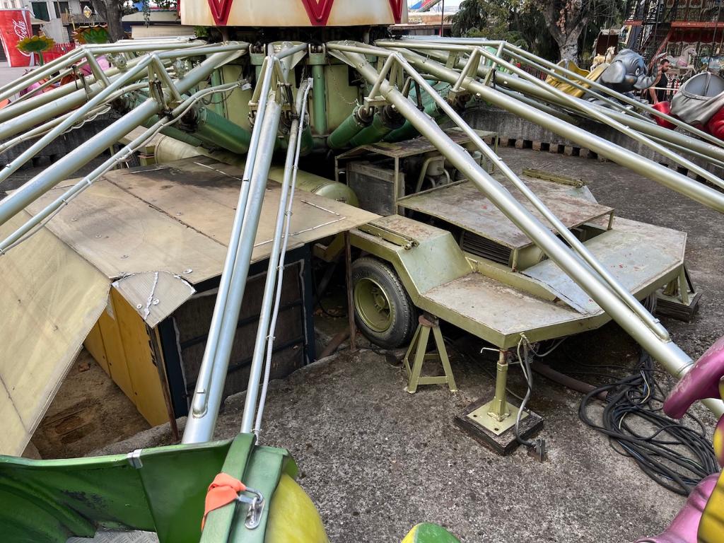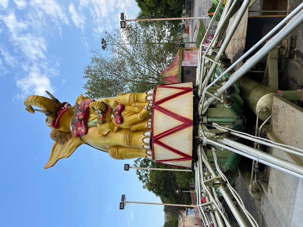 This ride was originally produced by SDC (Italy) in the 1980s as a trailer and was later renovated with the addition of a new central figure in the early 2000s. The original trailer can be seen inside, as well as a compressed air compressor located outside. The circular platform on this ride was constructed of concrete.