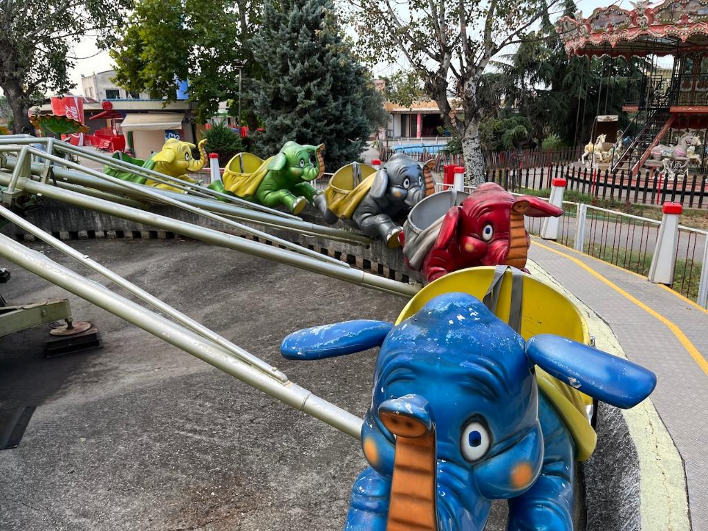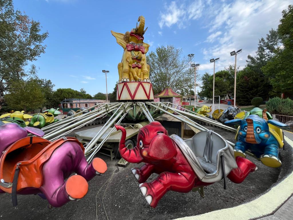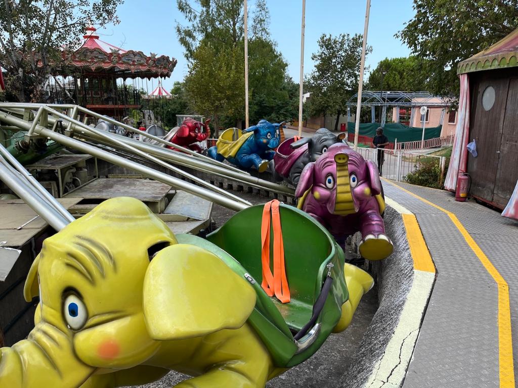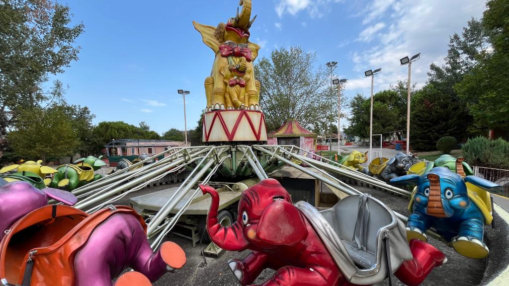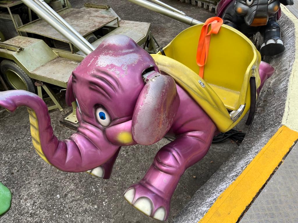 This ride was originally produced by SDC (Italy) in the 1980s as a trailer and was later renovated with the addition of a new central figure in the early 2000s. The original trailer can be seen inside, as well as a compressed air compressor located outside. The circular platform on this ride was constructed of concrete.